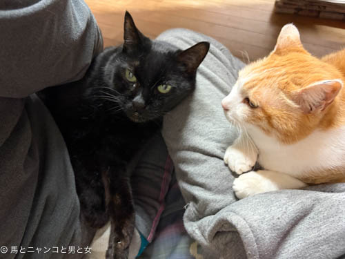 「オトじい」が鳴き続けてたので ちこ太郎が膝の上に乗せると鳴きやんだ。で 「まっちゃん」にドヤ顔で迫る。子供じみたじいさんである。 リスか···