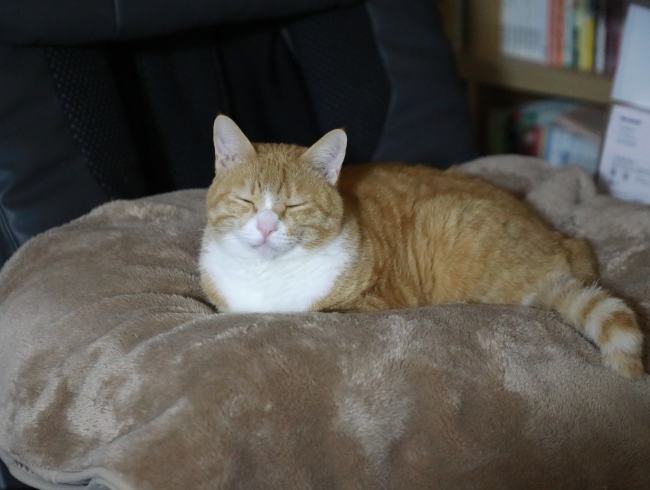 マッサージ椅子に猫らがまた乗り始めたので 猫ら好みの毛布を広げておいたら 床暖房で暑くなったユウがさっそくまったりしておる。と、思っていたら!···