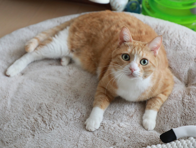 リビングのふかふかには ユウが時々寝そべっているので置き場所に迷っていた二つあるどら焼きの一つを こちらに移動してみたら早速アミ姐さんがチェッ···