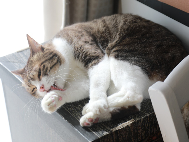 晴れた日には窓辺の箱の上で 日光浴を楽しむアミ姐さん。せっせと毛繕いをしてビタミンDを摂取する様子を目を細めて眺めているのは下僕たちだけでは···