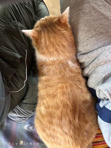 朝ごはん時 ちこ太郎との間に割って入って温まってる「まっちゃん」。「オトじい」もσ(^^;)の股間を利用して温まってる。 腰の右に付いてる白いも···