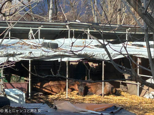 昨晩結構な量の雨が降ったので外に敷いてた寝わらを馬小屋の中へ移動。 朝 見たら馬小屋の中でマロン&プリンが横たわってた。 昔テレビで見たハイ···